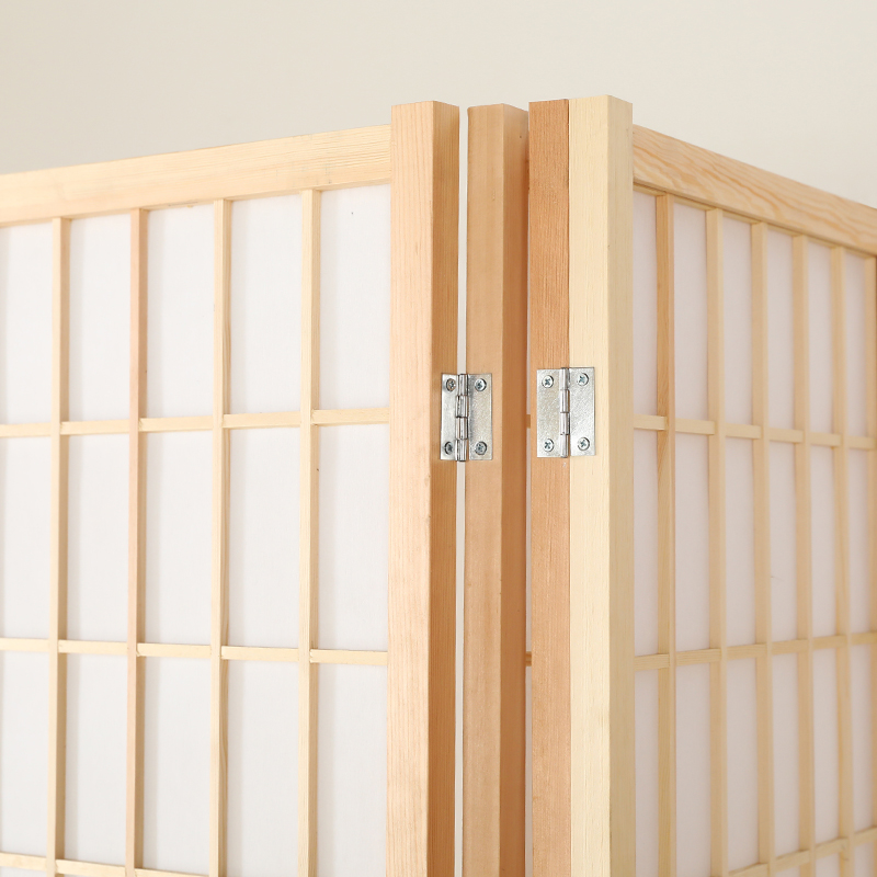 伝統的な格子模様が美しい木製のパーテーションです。 四連タイプで自由に角度を調整でき、空間を柔軟に仕切ることができます。 木の温もりと和紙調の格子が織りなす優雅なデザインは、和室にも洋室にも調和します。 リビングや寝室、店舗などで目隠しや間仕切りとして活躍し、落ち着いた雰囲気を演出します。 木の素材感を活かした自立式のパーテーションで、移動も簡単です。