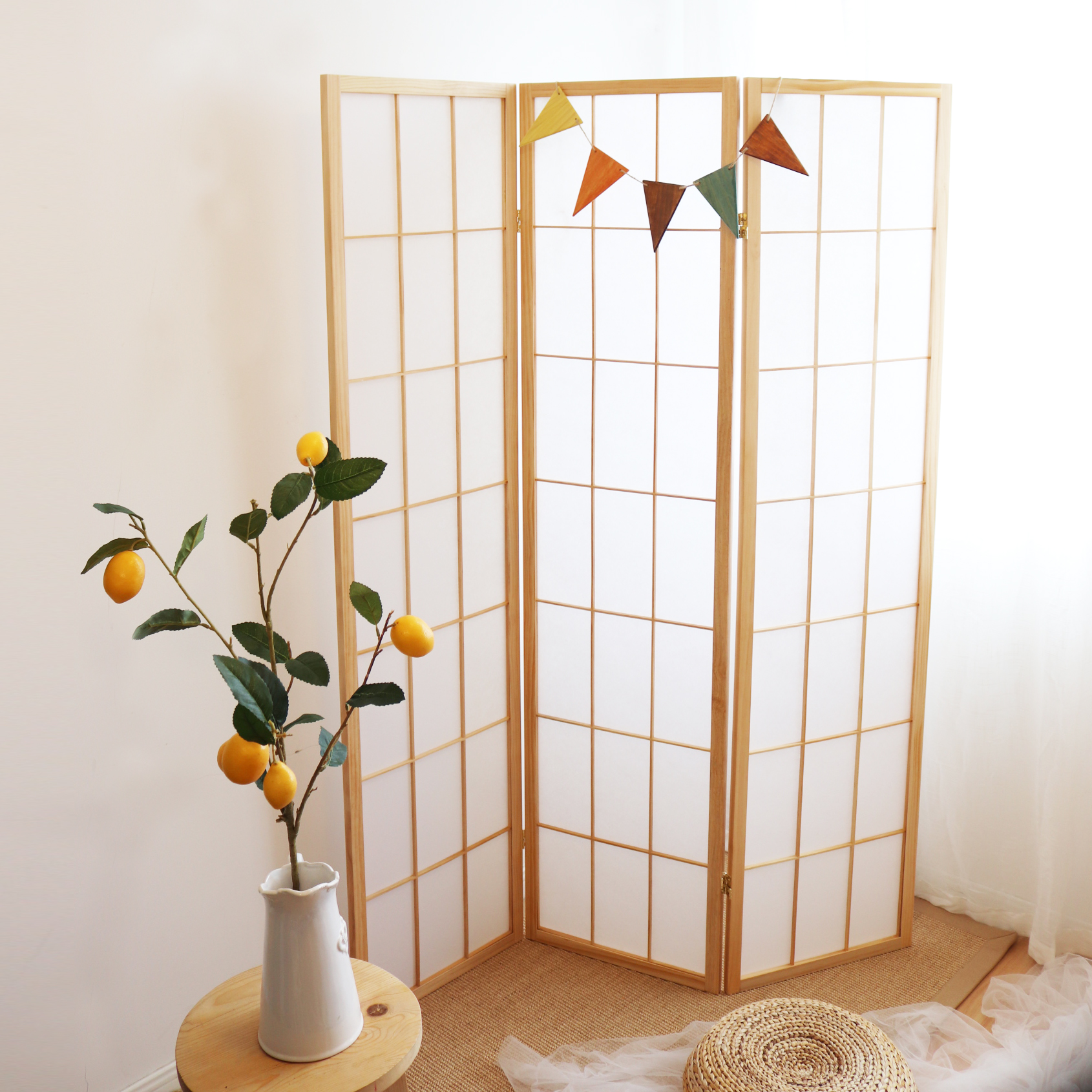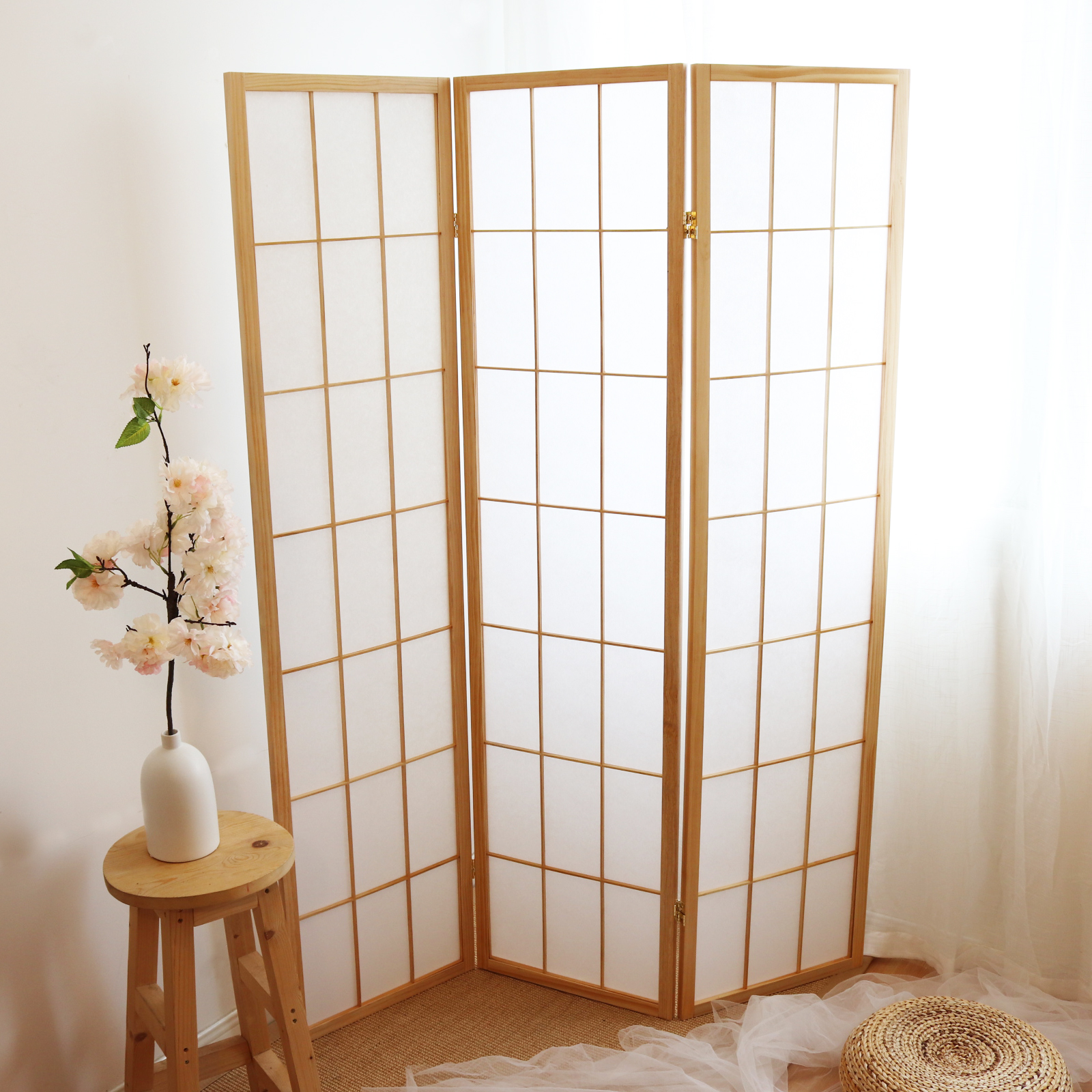 天然木の温もりを感じる三連折りたたみ式のパーテーションです。 木のフレームに半透明の障子紙を組み合わせた和風デザインが、お部屋に落ち着いた雰囲気をもたらします。 軽量で移動しやすく、角度調整も自由自在なので、間仕切りや目隠しとして様々な空間で活躍します。 自然素材の木を使用しているため、環境にも優しく、長くお使いいただけます。
