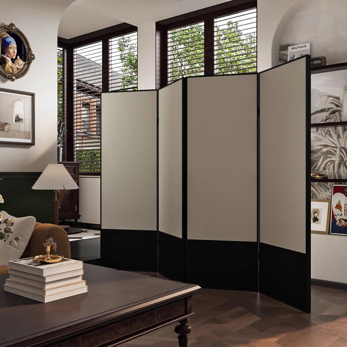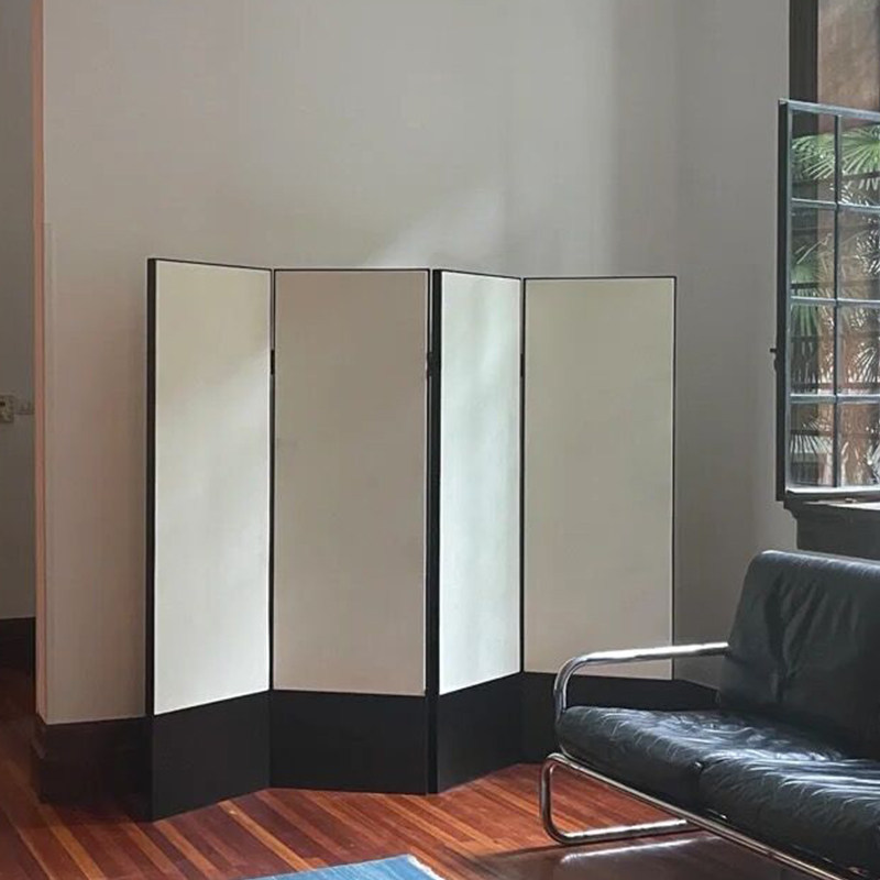 空間を自在に仕切ることができるパーテーションです。木の枠組みに布地や半透明素材のパネルを組み合わせた四連式の衝立で、蝶番により自由に角度を調整できます。