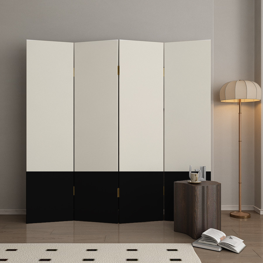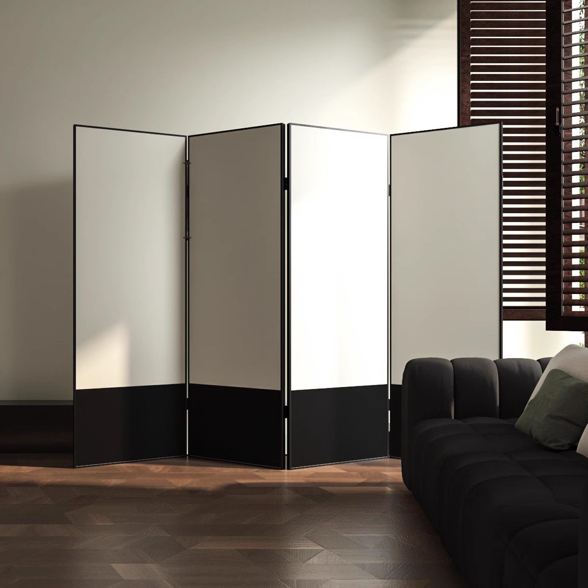 空間を自在に仕切ることができるパーテーションです。木の枠組みに布地や半透明素材のパネルを組み合わせた四連式の衝立で、蝶番により自由に角度を調整できます。 下部には安定感のある木製の台座を備え、しっかりと自立します。 リビングや寝室、店舗など様々な場所で目隠しや空間の間仕切りとして活躍し、洗練された雰囲気を演出します。 折りたたみ式なので使わない時はコンパクトに収納可能です。