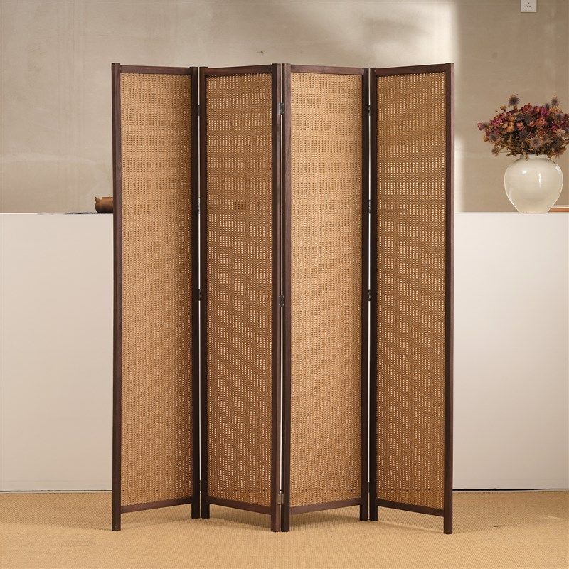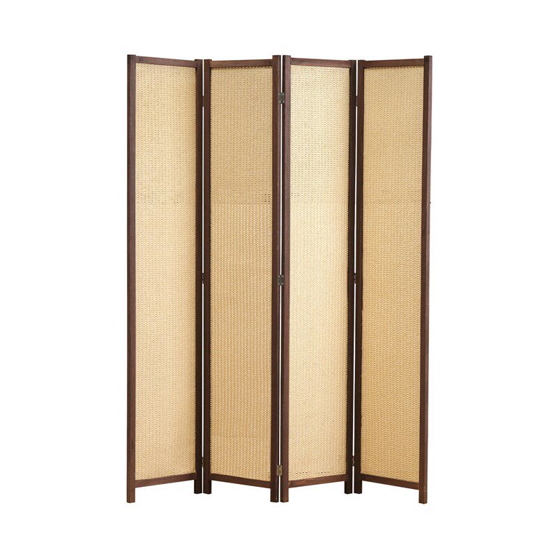 木のフレームが温かみを感じさせる四連式のパーテーションです。 蝶番で連結された四枚のパネルは自由に角度を調整でき、空間を効果的に仕切ることができます。 編み込み素材のパネルは適度な透け感があり、圧迫感を与えず明るさも保ちます。 折りたたみ式で使わない時はコンパクトに収納可能です。 木の質感を活かしたフレームデザインが、和洋問わず様々なお部屋に調和します。 目隠しや間仕切りとして、リビングや寝室など多用途にお使いいただけます。