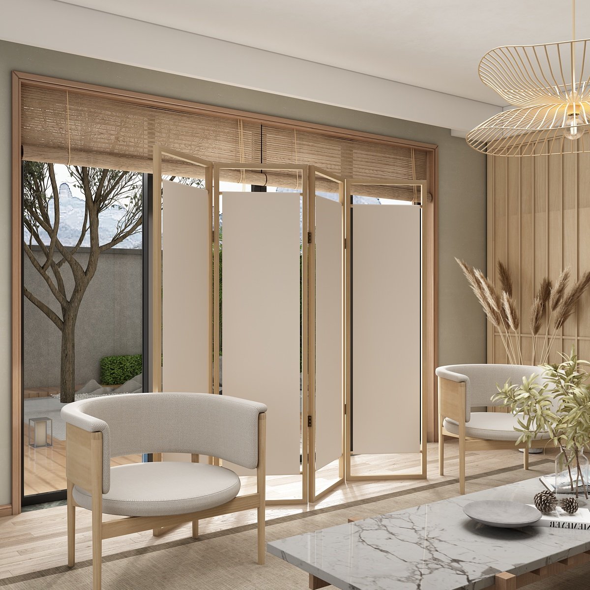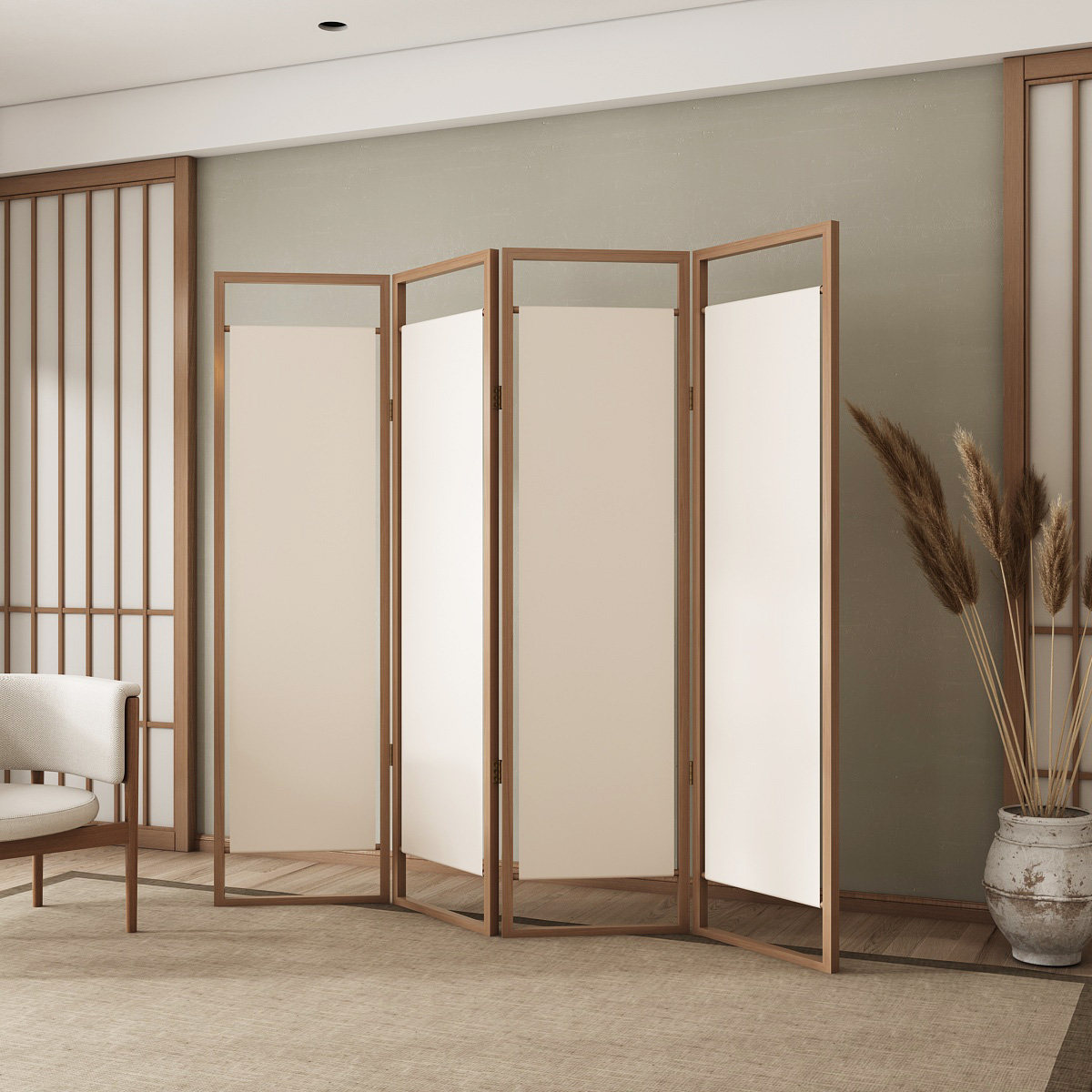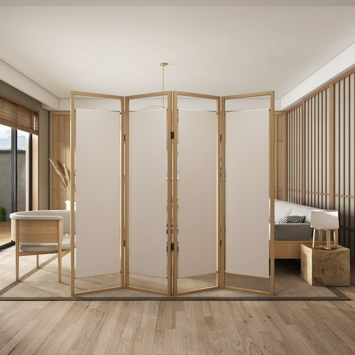 天然木のフレームと布製パネルを組み合わせた上質なパーテーションです。 四連の折りたたみ式設計により、空間を自由に区切ることができ、使わない時はコンパクトに収納可能です。 木の温もりを感じる優しい風合いが、和洋どちらの空間にも調和します。 軽量で移動も簡単なため、居室や事務所など様々な場所で活躍します。 プライバシーの確保や目隠しとしても最適な間仕切り家具です。