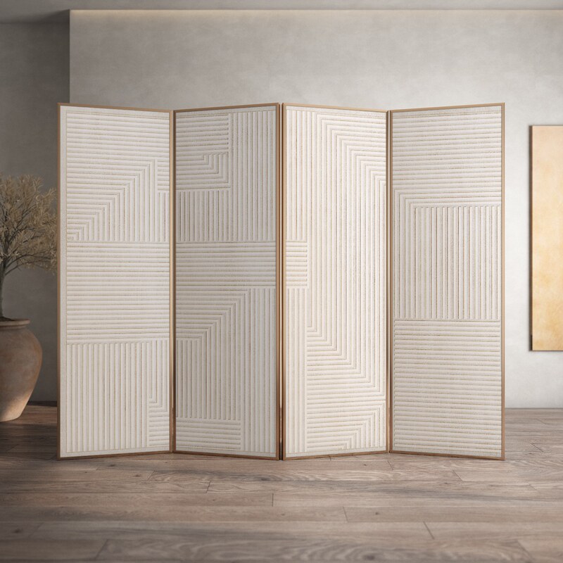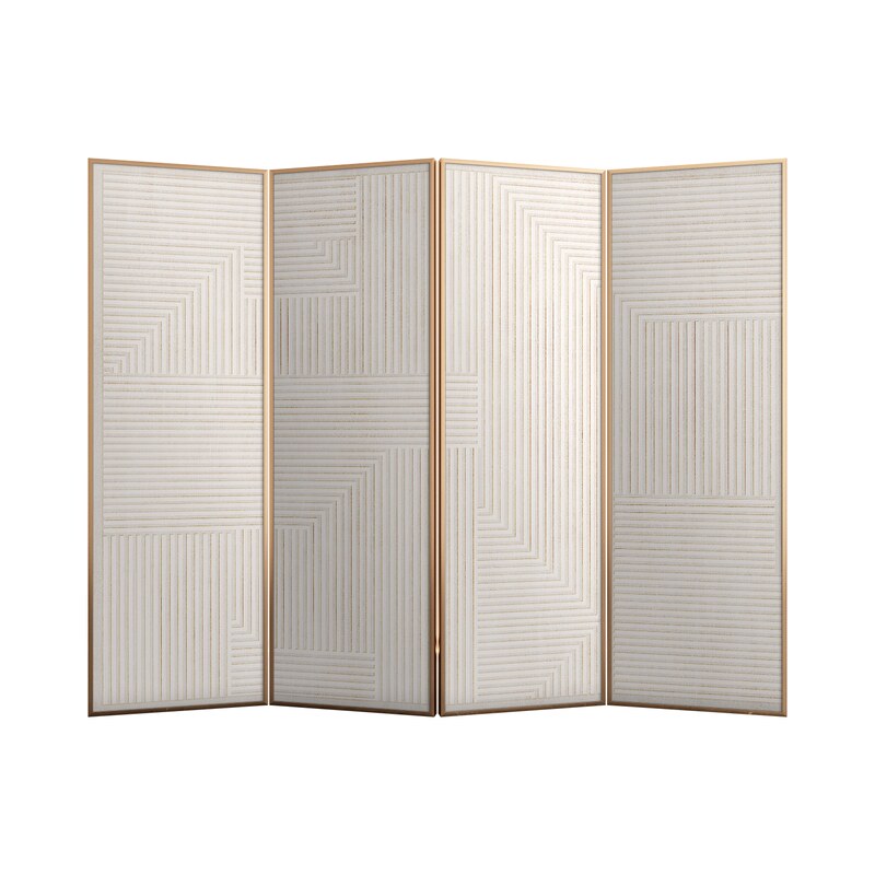 繊細な線の幾何学模様が美しいガラスパーテーションです。 四連の折りたたみ式で、空間を自由に仕切ることができます。 木製フレームが上品に縁取り、和洋どちらの空間にも調和します。 目隠し効果を保ちながら光を通すデザインで、お部屋を明るく保ちつつプライバシーを確保できます。 リビングや寝室、店舗など幅広い場所でご利用いただけるパーテーションです。