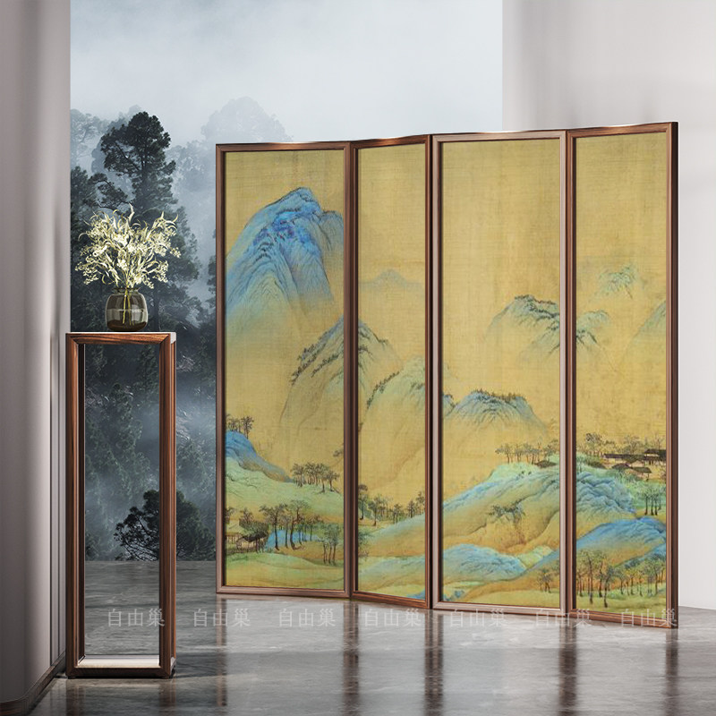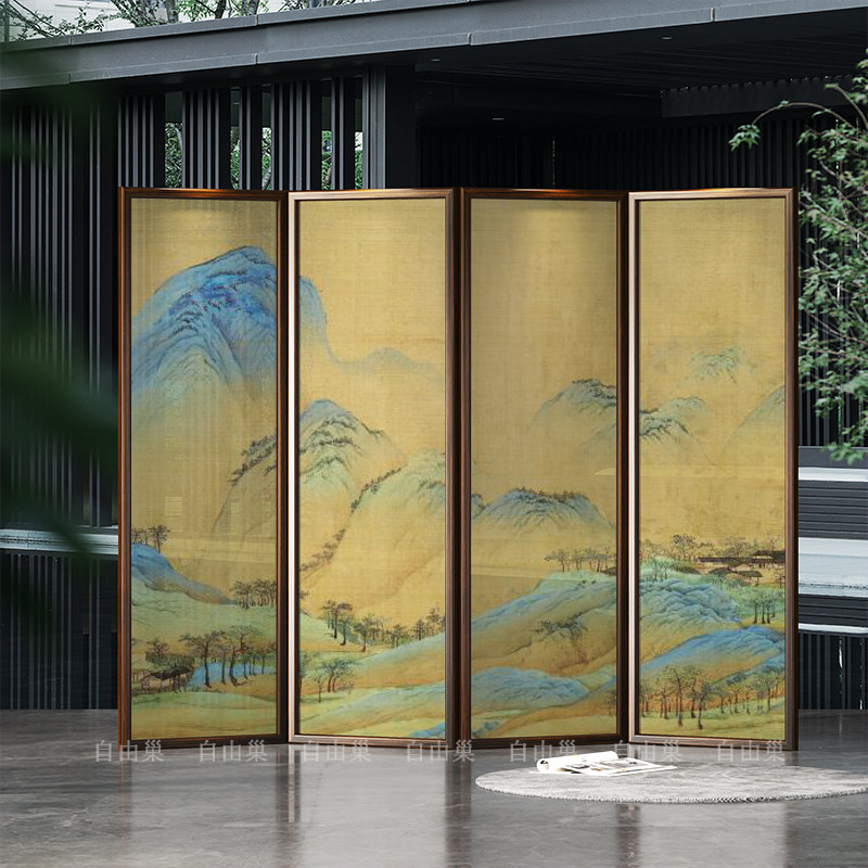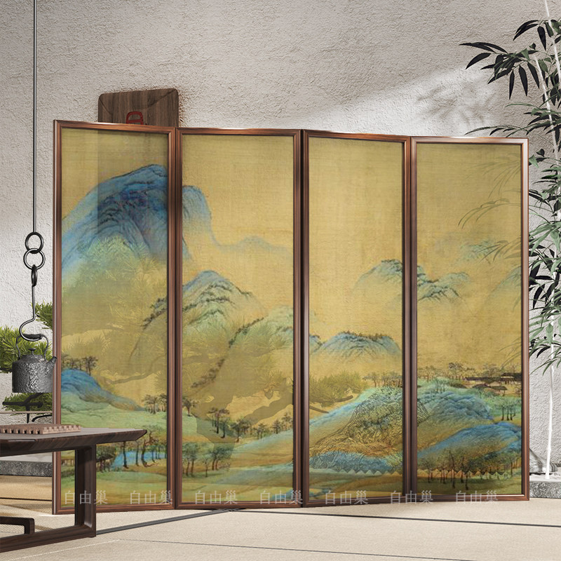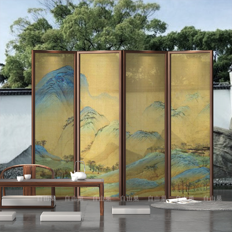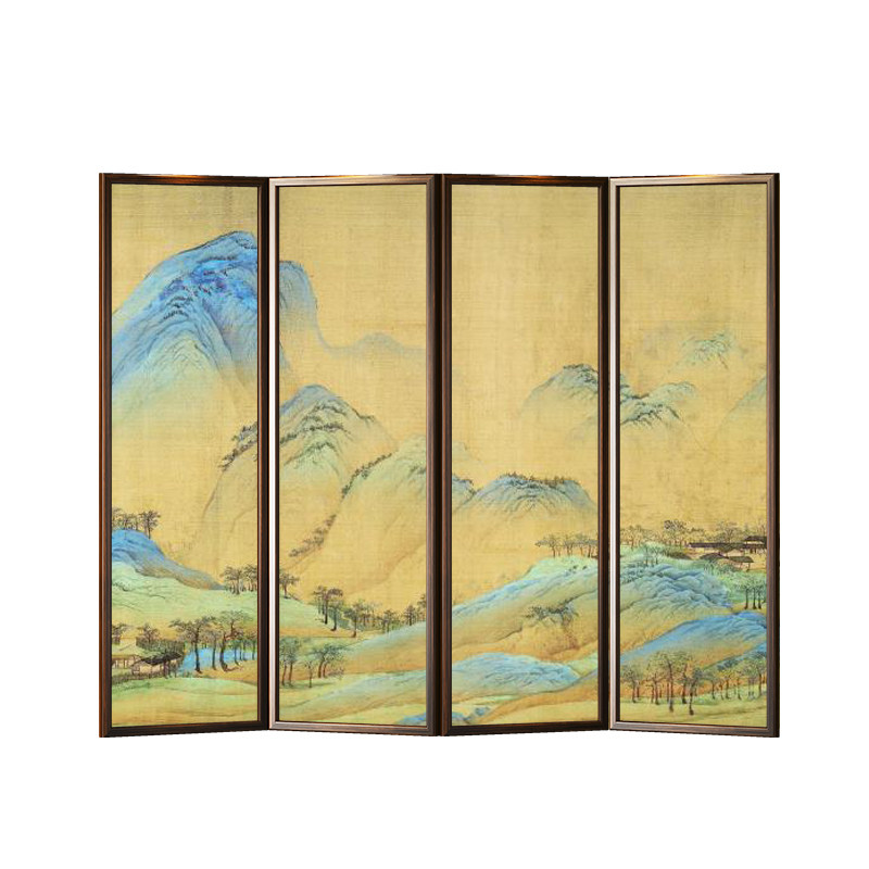 伝統的な山水画を描いた四連折りたたみ式のパーテーションです。