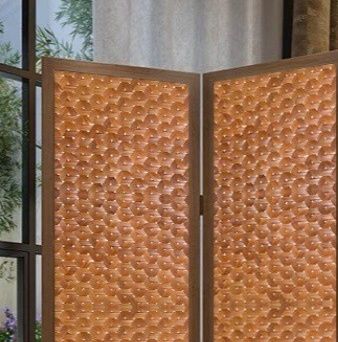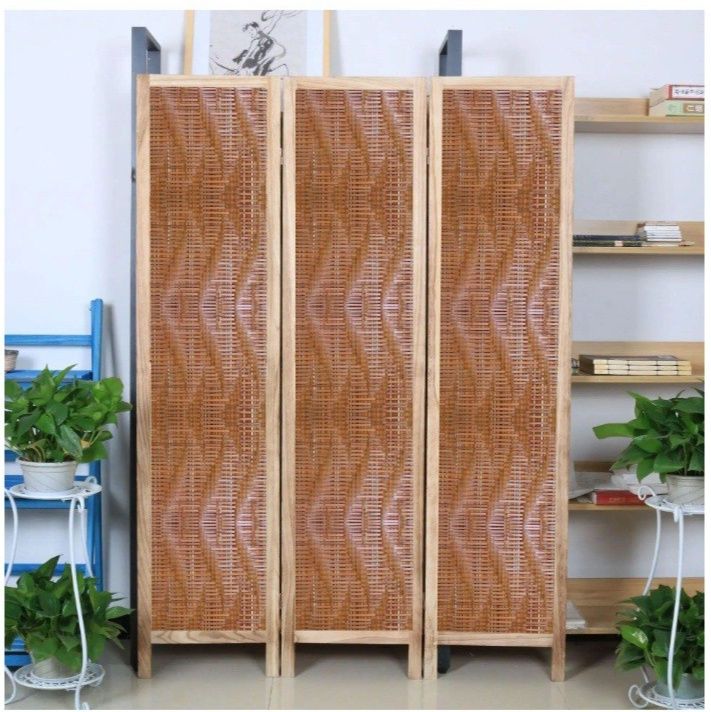 天然素材を丁寧に編み込んだ三連パーテーションです。木製のフレームに温かみのある編み込みパネルを組み合わせ、空間に優しい雰囲気を演出します。